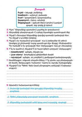 Գրքում կան աշխատանքներ, որ պետք է իրականացնես տանը՝ ընտանիքիդ անդամների օգնությամբ և մասնակցությամբ, մյուսները՝ մենակ կամ ընկերներիդ հետ՝ դպրոցում և դպրոցից դուրս: Միասին ոչ միայն ուրախ ու հետաքրքիր կլինի, այլև՝ օգտակար, կխոսեք, կքննարկեք հարցերը՝ կիրառելով հայերենը և զարգացնելով բանավոր ու գրավոր հաղորդակցվելու հմտությունները: